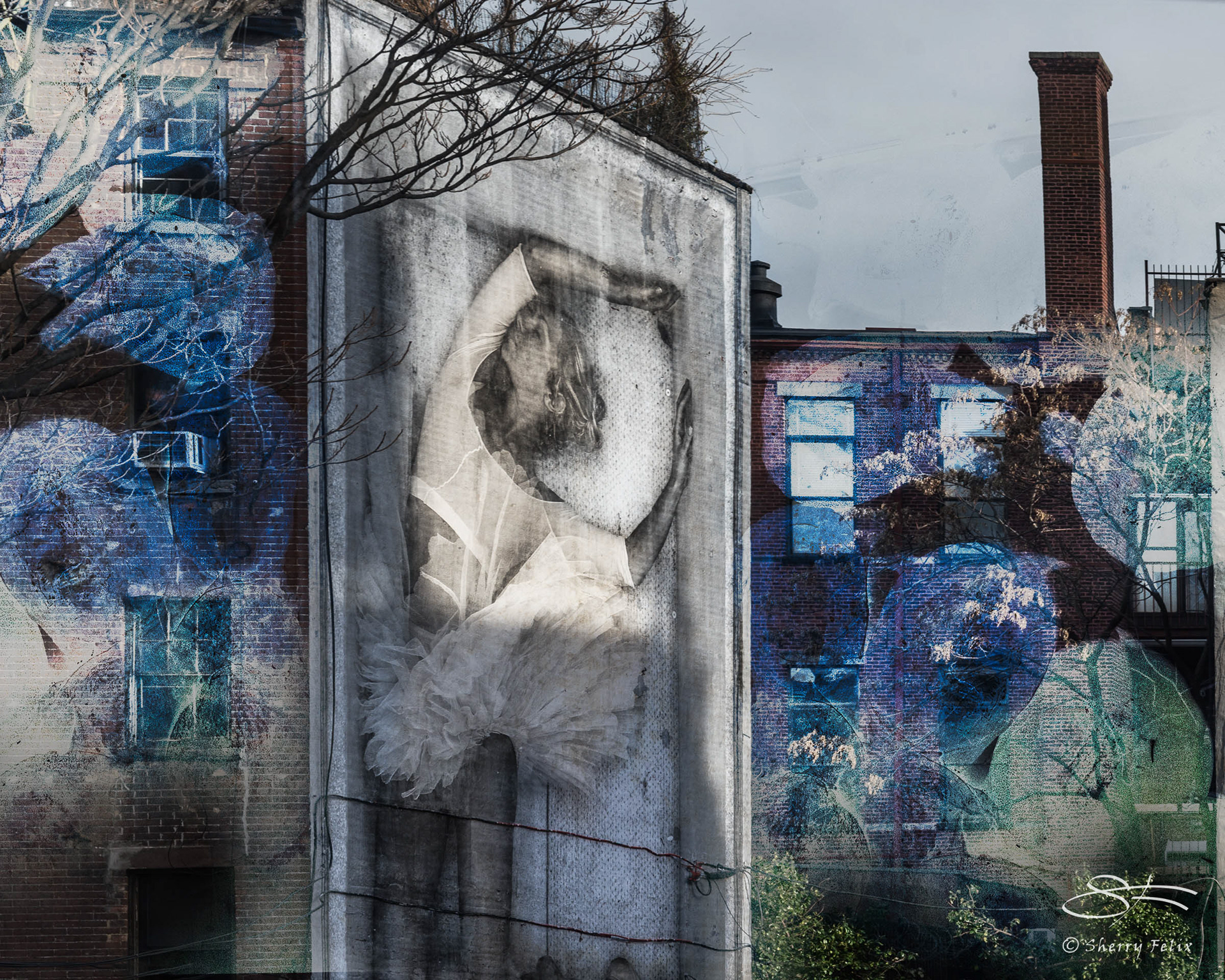 To create my impression of a day in Chinatown I started with a mural at Second Avenue and 1stStreet, East Village, NYC in Photoshop. I then imported turtles taken at the Chinese Market under the Manhattan Bridge at East Broadway. I used a blend mode “divide” opacity 65% duplicated the layer and used a blend mode “subtract” opacity 20%. I duplicated those two layers and flipped them and placed part on the left wall. The result is a ballerina floating among cloud like turtles.